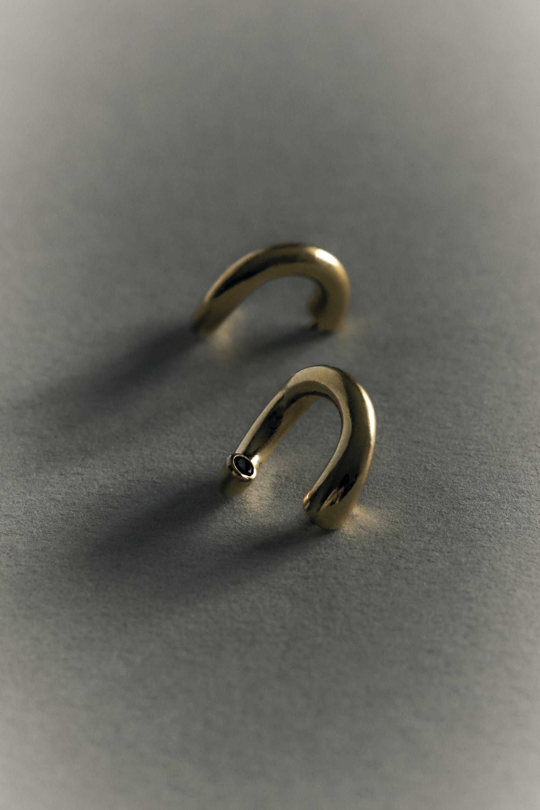 Una versione moderna dei classici orecchini a cerchio. Questo set di solidi cerchi dorati con una linea che curva attorno al lobo dell'orecchio è rifinito con un rubino. La pietra preziosa rossa evoca mistero e fascino. Il set di orecchini è hefatto ad Anversa.