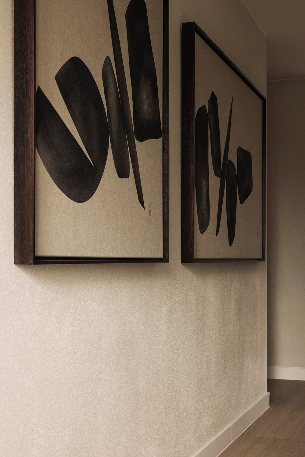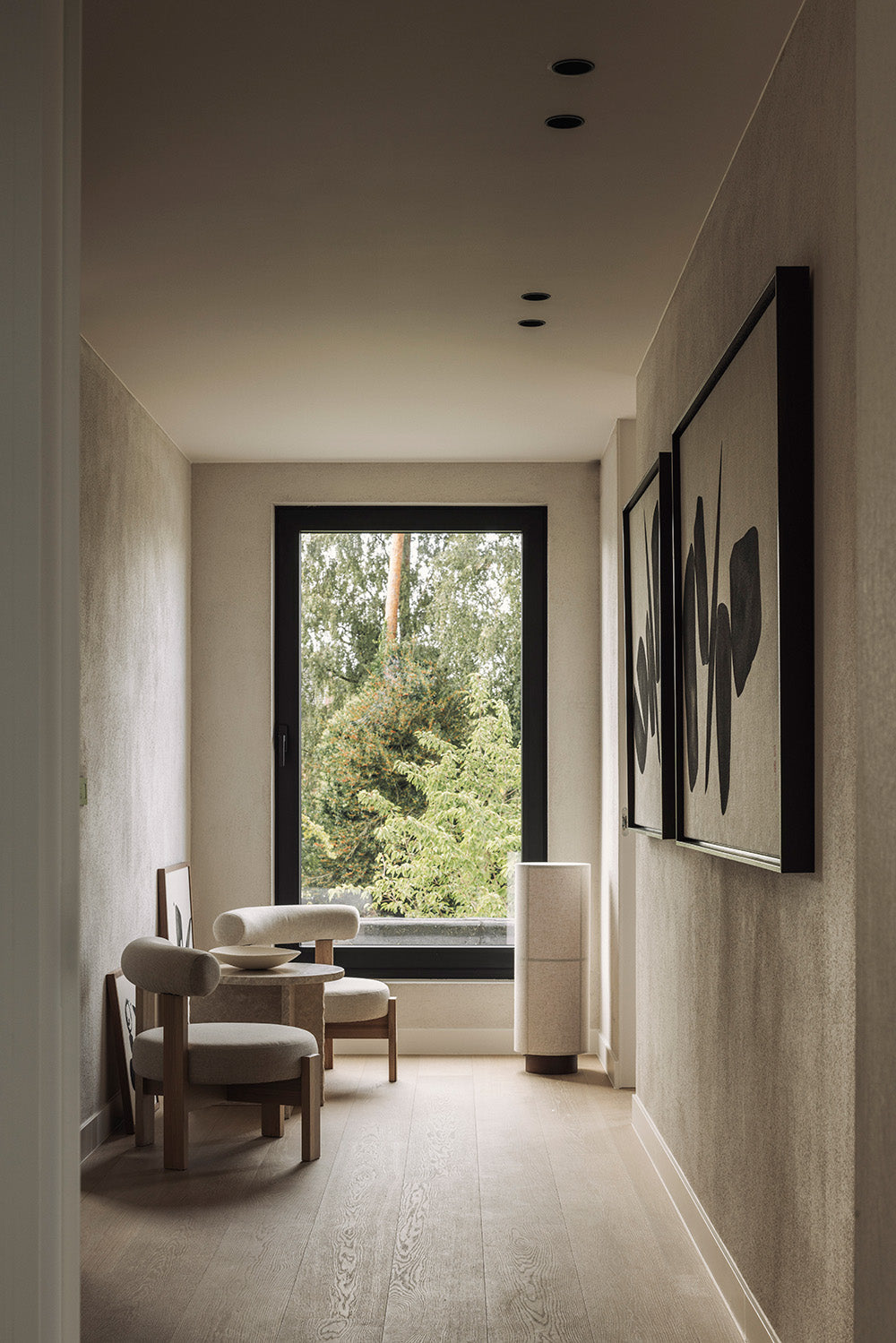 디자인에 있어서 우리는 직관에 따라 목재, 리넨 등 천연 소재의 사용을 우선시했습니다. 전체 컨셉이 매끄럽게 조화를 이루어야 하고, 결국 모든 것이 유기적으로 어우러져야 했습니다. 점토와 흙을 사용하는 Eleanor Herbosch와 Laura Pasquino의 작품을 포함하여 천연 재료가 예술 작품으로 확장되었습니다. 일본의 영향은 일본식 잉크를 사용한 Atelier de Rijk의 작품을 통해 미묘하게 스며듭니다.